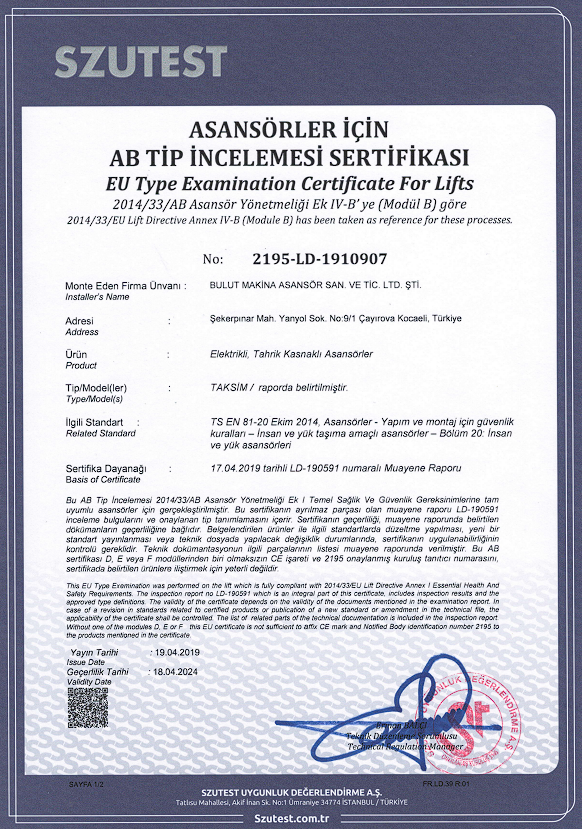 TAKSİM-ASANSÖRLER İÇİN AB TİP İNCELEMESİ SERTİFİKASI